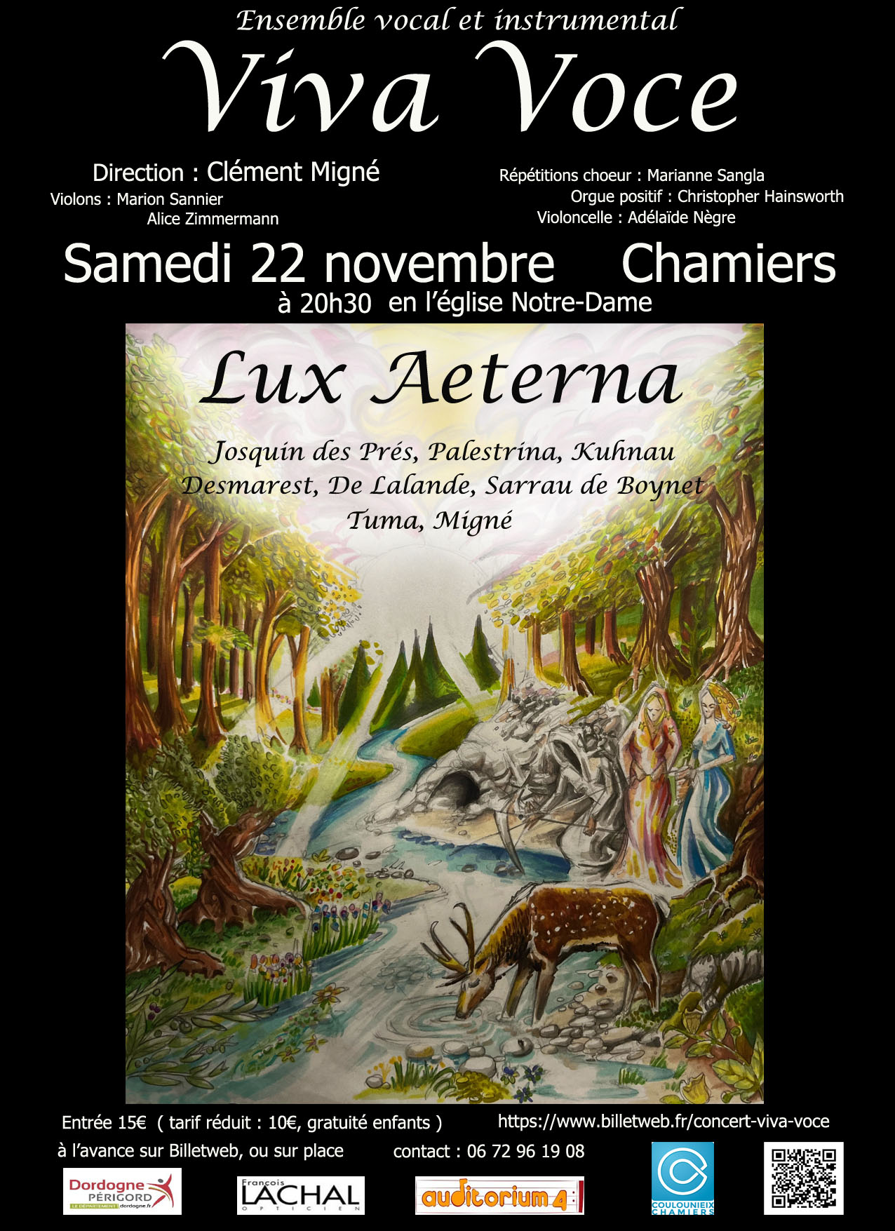 Le chœur Viva Voce, à quatre ou cinq voix dans ce répertoire, sera accompagné d’un ensemble intrumental composé d’un continuo à l’orgue positif, et d’un ensemble à cordes (violons, alto, violoncelle et contrebasse).